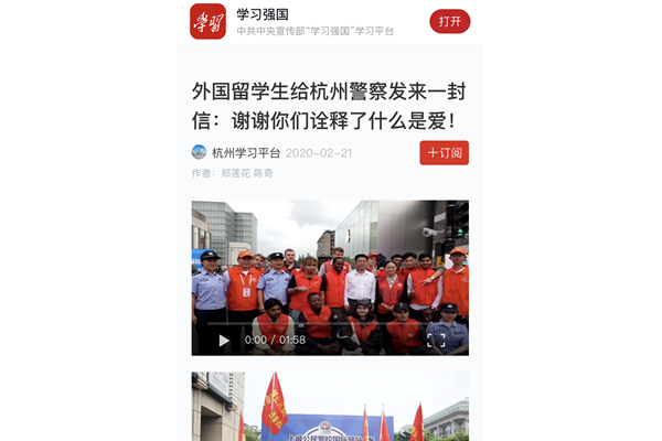 学习强国:外国留学生给杭州警察发来一封信:谢谢你们诠释了什么是爱!