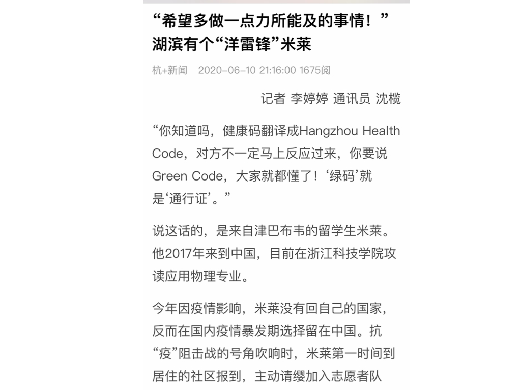 杭+新闻:“希望多做一点力所能及的事情!”湖滨有个“洋雷锋”米莱