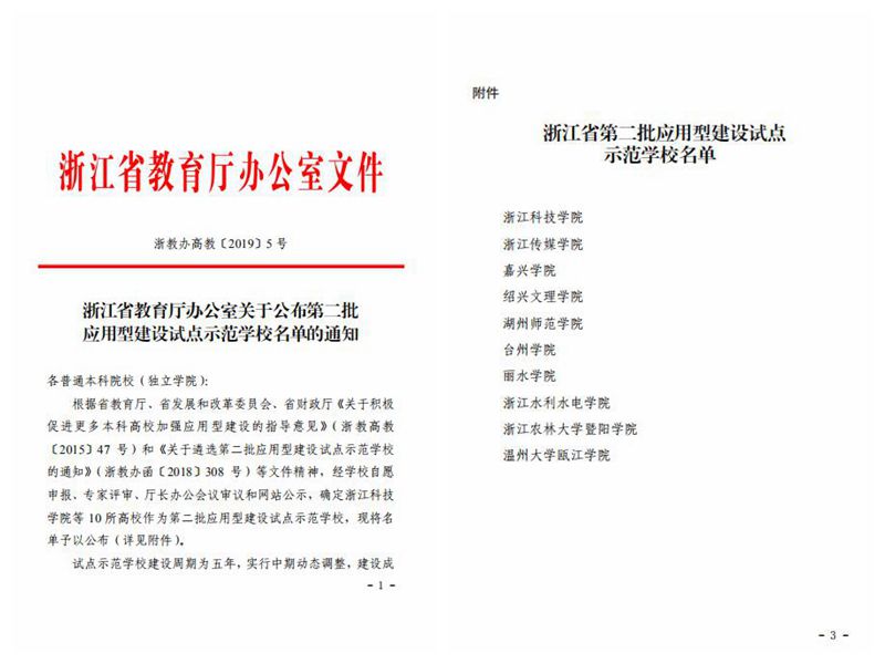 多年来,学校通过大力推进教育教学改革、强化创新创业教育、招生就业和研究生教育发展迅速,实现应用型人才培养质量新提升。并通过优化学位点布局,不断拓展学科平台,科研实力稳步加强,科技成果转化力度加大,实现应用型学科科研成果跃上新台阶。学校于2015年被列为浙江省应用型建设试点高校,2017年12月,参加并通过浙江省教育厅组织开展的应用型本科高校建设评价工作。2018年11月,学校向省教育厅申报应用型建设试点示范学校,经过专家评审、厅长办公会议审议、网站公示,最终获得批准。