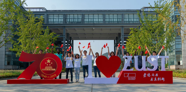 9月起,校园里一派欢庆的气氛,主干道红艳艳的道旗,分别写有“热烈庆祝中华人民共和国成立70周年”“不忘初心 牢记使命”等大红字样,让师生感受到浓浓的喜庆氛围。小和山校区银杏广场上竖起了半人高的小雕塑,分别有庆祝中华人民共和国成立70周年标志和“I ❤ZUST”字样,路过的师生,纷纷停下脚步与它们合影留念。
