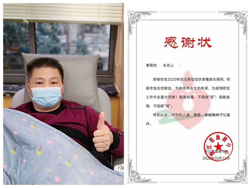 作为全国无偿献血金奖的获得者,安吉校区后勤党支部寿青山在疫情期间两次“逆行”,踏进浙江省血液中心,“在全国抗击疫情的非常时期,街头人员稀少,采血量严重不足,我是一名党员,我愿意贡献我的一份力量。” 1月16日、1月30日,两次献血间隔仅14天,这也是血小板采集最短周期。寿师傅说:“新闻里看到医护工作者去驰援武汉我都泪目了。无偿献血是医疗临床用血的重要来源,只有发动社会各界健康适龄人来自愿捐献,血库的血源才能得到保障!”