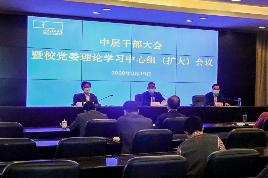 3月19日下午,学校举行干部大会暨校党委理论学习中心组(扩大)学习会。校党委书记龚建立传达近期习近平总书记对推进新冠肺炎疫情防控和经济社会发展工作作出的部署和重要讲话精神。校长赵东福就下阶段全校疫情防控和2020年学校事业发展各项工作作部署。会议由校党委副书记符宁平主持。校党政班子成员出席会议。根据疫情防控工作要求,会议采用主会场+分会场直播形式举行,全体中层干部、专职督查员、院长(主任)助理、专职党委委员、民主党派主要负责人等在各会场参加会议。