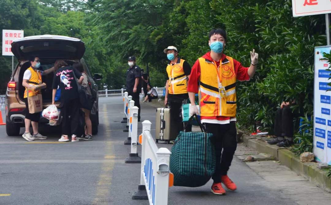 5月12日,焦健峰正式上岗工作,被安排在西和总服务站值守,从早上7点半到下午6点半,核验返校码、引导车辆、运送行李……哪个岗位需要人他就顶上。上午10点到12点和下午3点左右,这两个时段是当天同学返校的高峰,焦健峰与其他志愿者在西和公寓门口开始疏导交通。“我也是第一次做,看着旁边学校保安向车辆发出的停止、直行等指挥手势,我也有样学样。”焦健峰说:“帮同学搬行李时,我们就开始了‘流水线’似的高效工作。”返校同学进入校园,志愿者会根据同学所在宿舍楼的远近,选择将行李送上转运车运送到楼下,或者直接送达宿舍楼,由下一站志愿者接手,一起送入寝室。