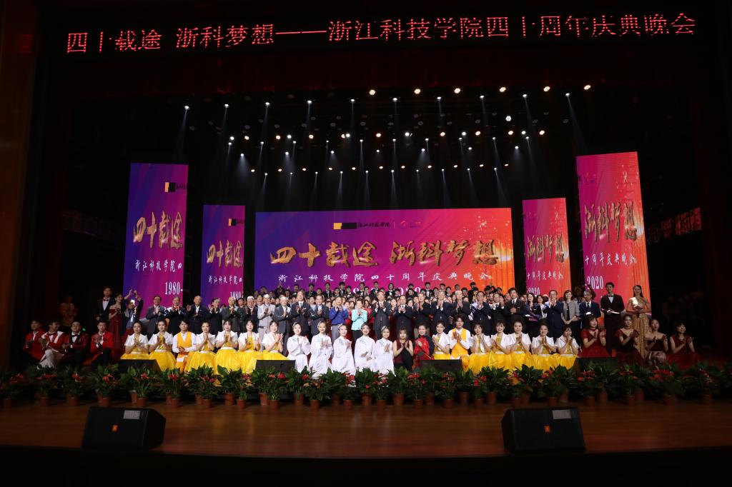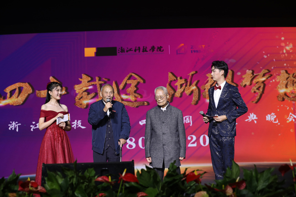 晚上18点30分许,“四十载途 浙科梦想”建校四十周年文艺晚会在小和山校区举行。校领导,校友、离退休教职工及师生代表欢聚一堂、共享盛宴。晚会分为“浙科初生、矢志发展”“大树根深、桃李芬芳”“你我同行,逐梦芳华”3个篇章,融合演唱、舞蹈、器乐、声乐等多种表演形式,将学校40年来风雨兼程砥砺奋进的发展历程一一呈现。离退休老同志与在校学生配合表演的情景剧《第一步》掀起了晚会的高潮,一张张历史图片、一幕幕艰辛创业片段,让师生自豪与感动。当两位建校创始人代表郑再荣(87岁)、马振邦(92岁)老师蹒跚走上舞台时,在场师生发自内心鼓掌致谢。两位老师说“从建校时的两百学生,到今天的两万学生,学校发展进步真大。”“祝浙江科技学院越办越好!”全场沸腾。