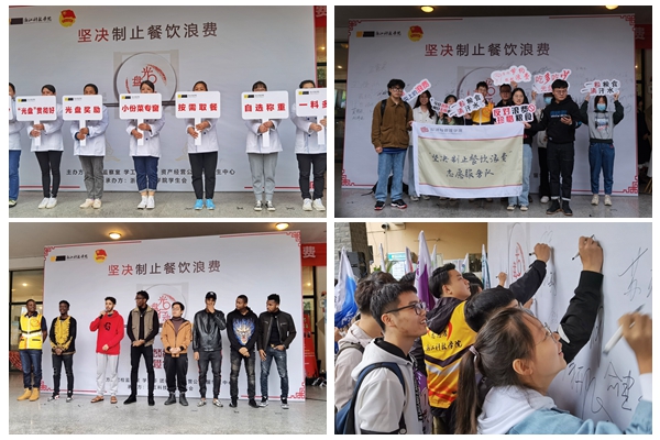本次活动由纪检监察室、学工部、团委、资产经营公司、留学生中心主办,学生会承办。食堂的工作人员手持“光盘奖励”“小份菜专窗”“自选称重”等宣传标语展示了光盘行动的具体举措。学生代表宣读“光盘行动”倡议书,向全校同学发出“从现在做起,从自身做起,从节约粮食做起,争做勤俭节约的传承者、实践者和引领者。厉行勤俭节约,共建绿色校园!”的倡议。留学生代表用不同国家语言宣读“厉行节约,光盘行动”活动标语。诗朗诵《勤俭·节约》,呼吁大家培养勤俭节约的良好美德,让节约粮食形成一种新时尚、新潮流。活动中,全体到场人员共同演唱歌曲《我和我的祖国》,在对祖国崇高的致敬中,共同缅怀老一辈的开拓和节约精神。用餐高峰时段,同学来往就餐时可以看见与“坚决制止餐饮浪费”有关的宣传标语,增强了同学们节约粮食、珍惜粮食的意识。( 团委 学生记者 章韩璐、吴婕/文 余雁鸿/摄)