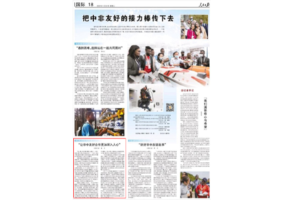 11月24日,《人民日报》以《把中非友好的接力棒传下去》为题,讲述第五届中非青年大联欢期间,中非青年加强交流交往,增进对彼此国情和文化的了解,我校津巴布韦籍留学生、理学院/大数据学院学生米莱讲述他在中国学习、生活感悟,分享自己对中国社会经济发展变化的认知。(留学生中心 王飘飘)