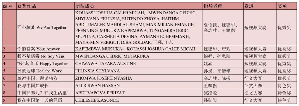 日前,第四届来华留学生征文暨短视频大赛颁奖典礼线上举行,我校选送的作品共获9项奖项(获奖名单详见下表),学校获“优秀组织奖”。