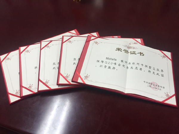 近日,我校留学生志愿者们收到由拱墅区宣传部为他们颁发的证书,表彰他们在拱墅区宣传部主办的G20峰会“英语角”志愿服务优异表现。