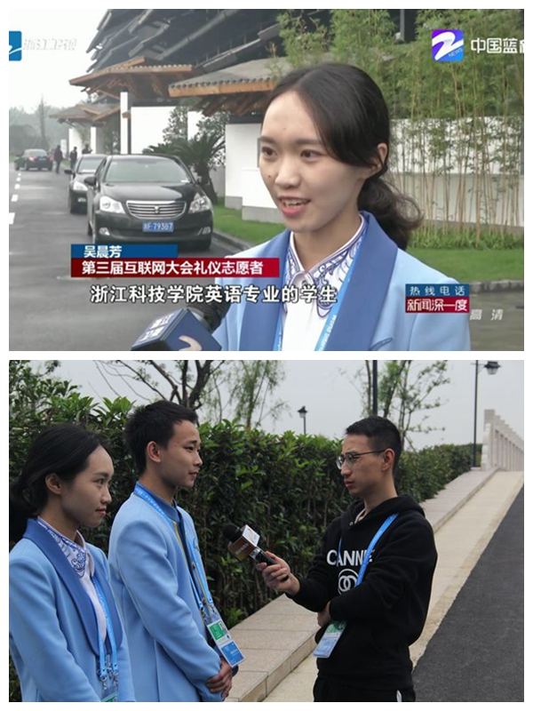浙科“小梧桐”的优异服务也得到了与会嘉宾的好评,第三届互联网大会志愿服务部部长、团省委副书记王慧琳多次慰问我校志愿者。杨元庆、雷军、周鸿祎、李书福等嘉宾也对我校志愿者交口称赞。我校志愿者受到媒体广泛关注,外国语/中德学院英语141班吴晨芳同学接受浙江卫视专访,我校“小梧桐”青春热情的形象登上嘉兴新闻综合频道、新华社、人民网、海外网、浙江在线、钱江晚报、青春浙江、多彩贵州网、嘉兴日报、嘉兴电视台、温州晚报等多家媒体。