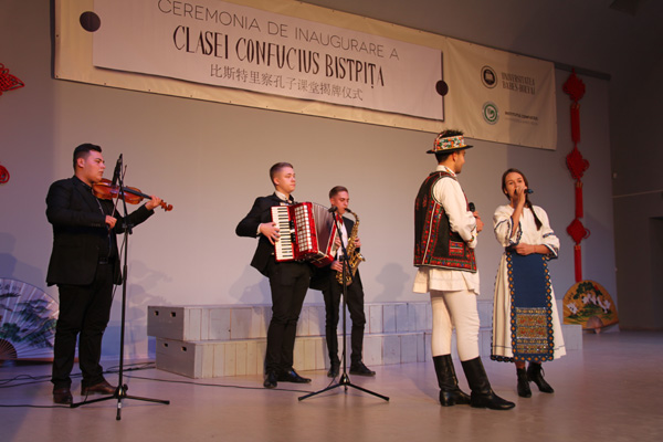 仪式结束后,嘉宾们观看了孔子学院教师、罗马尼亚艺术团和国立Andrei Muresanu学校学生等表演的精彩节目。
