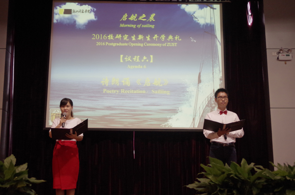9月27日上午9点27分,“启航之晨”2016校研究生新生开学典礼在图书馆西报告厅举行。校长叶高翔出席本次典礼。校党委委员、研工部部长毛建卫教授与罗马尼亚籍留学研究生谭明爱主持典礼。