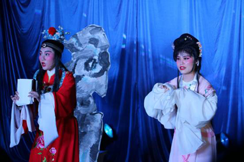 日前,我校晴岚戏曲社“越剧诞辰110周年”折子戏专场演出在A4-122精彩上演。晴岚戏曲社的同学们为大家带来越剧《红楼梦•读西厢》《何文秀•算命》《打金枝•闯宫》《新狮吼记•跪池》《啼笑姻缘•约会》《天女散花》,婺剧《连环计•小宴》等九出经典选段。演员们扮相俊朗甜美,唱腔、身段有板有眼,他们挥洒自如的表演,不时获得现场观众的阵阵掌声。