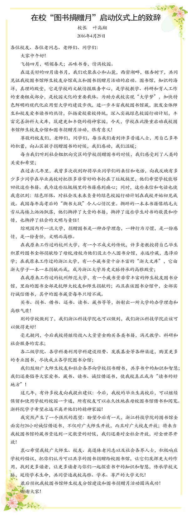 叶高翔代表学校致辞,他例举其他高校捐书实例,指出捐赠图书是一种办学理念,一种行为习惯,是一份感情,是一份责任,文明而高雅。他表示,学校鼓励广大师生校友和社会各界向学校捐书赠书,共享书中的知识和智慧;并倡导大家爱书、藏书、读书、诚信借还书,使我校真正成为“读书的好地方”!他号召广大师生积极响应学校的倡议,为助力我校实现“大学梦”,加快特色鲜明的现代化应用型大学的建设步伐,丰富我校图书馆藏,深入实施绿色校园行动计划,丰富完善浙科大文库,筑建更加丰饶的精神家园。让更多读者一起探索书中的知识和智慧,传承学校文脉,延续学术生命,共同营造出高雅、学术、尊严的大学文化!