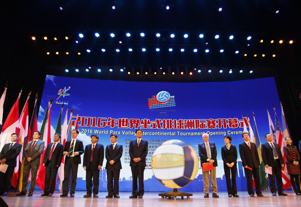 3月16日晚,2016年坐式排球洲际赛开幕式在我校安吉校区举行。世界残疾人排球联合会主席拜雷,中国残疾人联合会副理事长王梅梅,副省长熊建平,省残联理事长郑瑶,省政府办公厅副主任傅晓风,省残联副理事长陈玉国等领导出席开幕式。校党委书记王建华、校长叶高翔受邀出席。