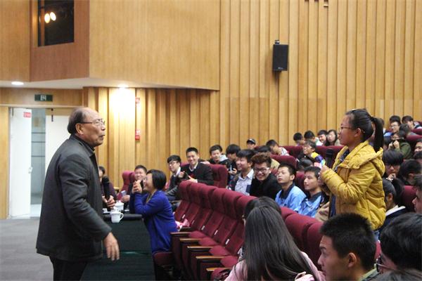 讲座中,龚昌德院士多次走下讲台,在学生身旁,用形象的肢体语言,向大家展现奇妙的物理现象,为同学打开通往物理世界的新大门,让他们看到了物理学奇妙之处。现场互动频繁, 龚昌德院士在同学身边有问有答,给同学发表看法的机会。同学在提问环节中迫不及待地连连发问,他都做出解释或给出个人观点。
