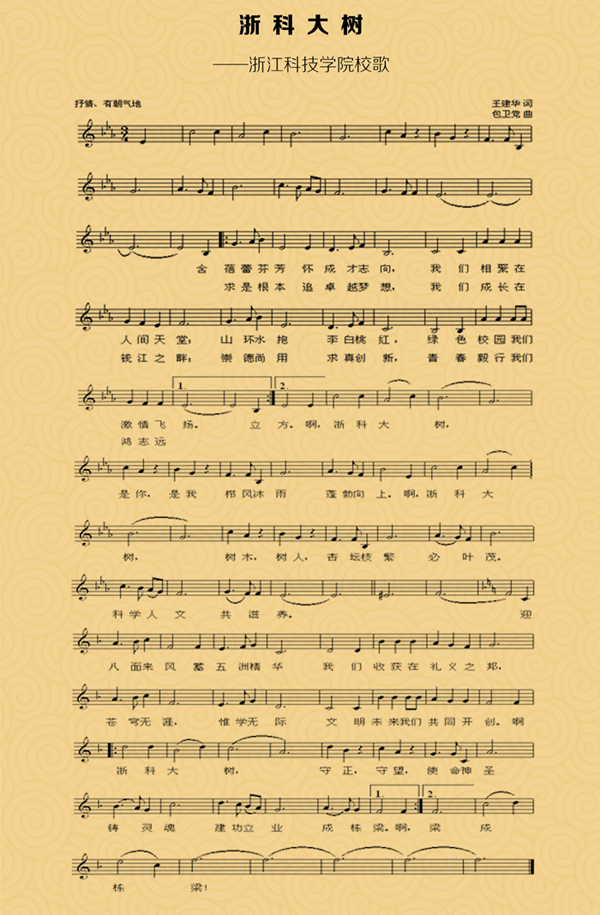 自2013年秋校歌创作征集活动启动以来,广大师生校友、社会各界人士广泛参与,词曲作者反复修改。最终确定的校歌,歌名《浙科大树》既是“浙科/大树”,也是“浙科大/树”,歌词立意新颖,内涵深刻,旋律简洁流畅,曲谱与歌词整体风格一脉相承。整首歌以树喻人,以树喻校,巧妙诠释了学校的办学理念、文化特色和价值追求,承载着广大师生校友对美好未来的憧憬与担当。
