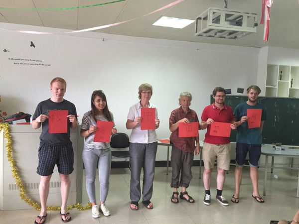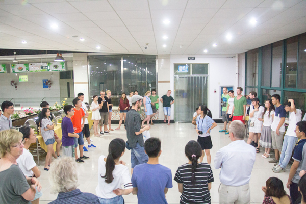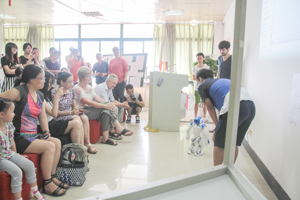 | 日前,第九届中德暑期夏令营落下帷幕。德国汉诺威应用科技大学4名机械、电气、计算机和艺术专业教授、14名学生,以及我校2013级即将赴德国汉诺威应用科技大学学习的31名2+3项目学生参加夏令营,德语专业二年级学生担任夏令营志愿者。副校长郑友取出席开营仪式,希望中德两国学生珍惜机会,共同学习,收获友谊和成长。 汉语课上,我校老师从基本的声母、韵母开始,逐步过渡到简单的生活用语,我校同学配合,与德国学生对话中文练习。我校同学准备丰富的课件,介绍中国文化,讲述两国文化的差异;周末,还带领德国学生游览杭州,了解杭州的历史文化。德国教授的专业课堂上,我校“2+3”项目学生与德国学生一起上课,提前体验德国高校上课方式,各专业教授传授学科最前沿的知识,机器人、自动扫地机、数字影象都走入课堂,艺术专业教授Felix还布置两国学生共同创作以两校合作30年为主题的作品。 中德两国学生还一起参观了中国茶叶博物馆、佑康公司,游西湖,练太极,举办联欢会。在学习成果展示会上,以专业为组别,两国学生共同展示了短短两周各自专业学习的成果。 图1 德国教授、学生展示中文学习成果 图2 两国学生共同创作以两校合作30年为主题的作品 图3 2+3项目学生与机器人对话 图4 中德两国师生联欢会 外语/中德学院