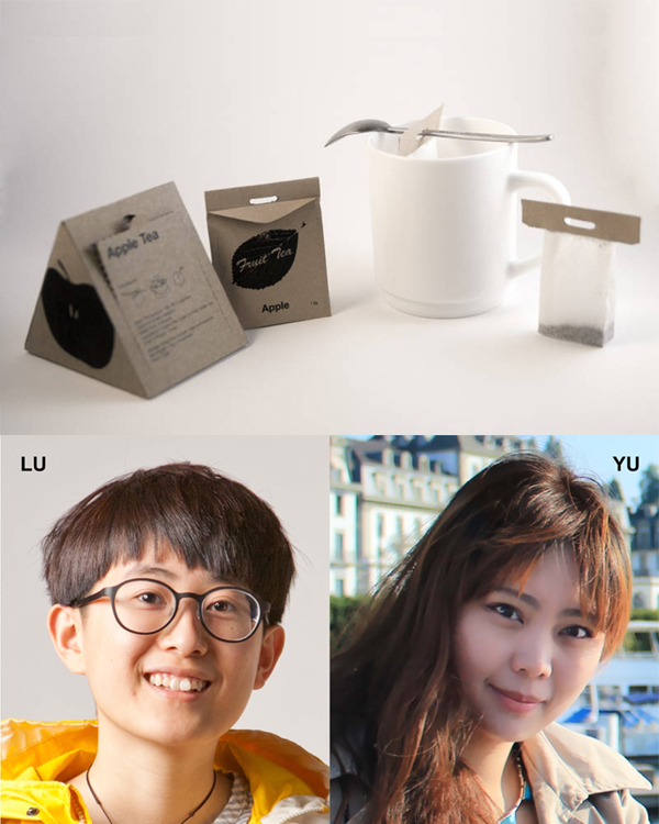茶在欧洲日常饮品消费市场上占据相当大的比例,茶包通常以铁质订书连接一根棉线,方便使用者将茶包从开水杯中拎取出来。卢莉蒙和俞靓用茶勺代替棉线,在茶包上设计一个扁形的长孔,使得茶勺穿过长孔,让茶包浸泡在开水中。使用100%可循环使用的环保材料,里外包装上均采用纯天然的植物性颜料。在欧洲包装生产界使用统一型号纸板的前提下,她们研发的三角形外包装设计相对于未改良的传统茶包装,能够多生产出160个包装盒,大大节约了生产成本,简化了生产流程。