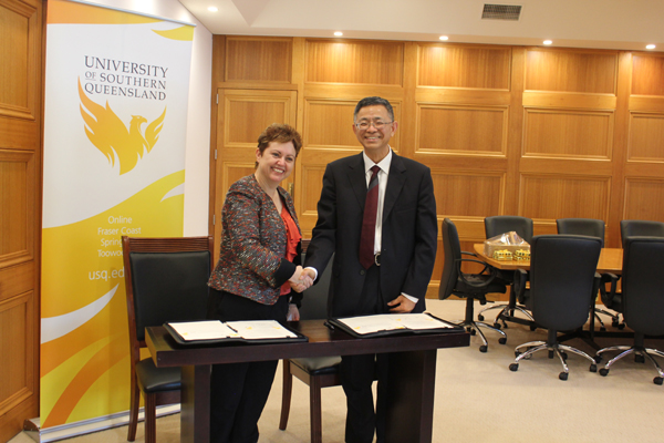 在南昆士兰大学,王建华与该校校长简•托马斯就两校间正在实施的计算机科学与技术专业中外合作办学项目进行磋商讨论,并就未来两校间师生交流、科研合作、教学合作等项目交换意见(图1)。双方表示将进一步拓展合作模式,加大合作力度,在科研、教师进修、研究生交流项目等方面加强合作,并着力推进两校间相关专业的联合培养项目合作。双方签署了学生交换协议。南昆士兰大学名誉校长约翰•多恩布什先生和图文巴市市长保罗•安东尼奥参加欢迎仪式。