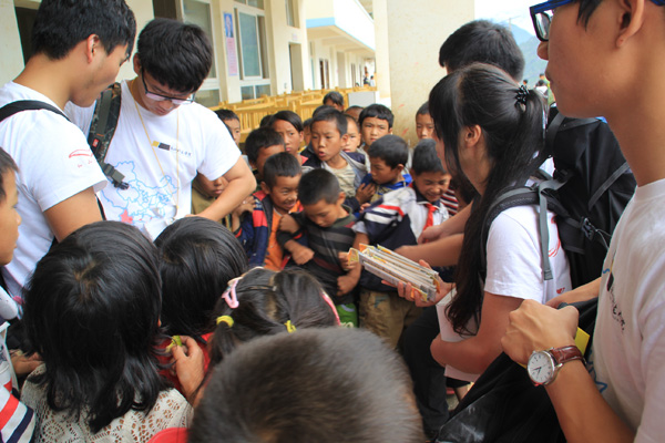 出发前,募捐物资从校内外汇集到校,队员们对其统一整理打包。到达昆明火车站时,因游客量大,物资繁重又碰上瓢泼大雨,重达300多公斤的爱心物资成了7名师生前行的最大难题。面对出站口长长的步行阶梯和如潮的人流,每两名队员合力抬起一只箱子,冲破重重阻碍,最终保证了每一批爱心物资不遗落,不损坏。7月2日,队员将前天晚上整理清点好的爱心物资带到学校准备发放,孩子们激动地跑了出来,围着队员叫着喊着,热情的欢呼声和好奇的讨论声感染了每一个队员的心。(图1)看着孩子们脸上露出的笑容,队员忘记了一路的艰辛与疲惫,一切的困难与阻碍都变得微不足道了。