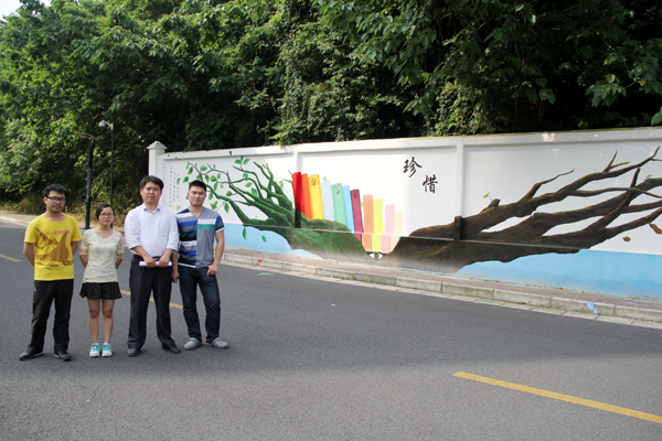 作品完成时,一直在自己办公室每天看着“大树”成长的轻工学院寇顺利老师特别来感谢,“你们美化了我的工作环境。”他还邀请自己的“得意弟子”一起,到墙绘前合影留念(上图)。