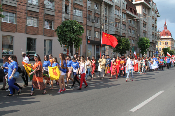 23日下午,城市周活动组织在克鲁日市的十几个国家文化中心,身着各自民族服装在市中心主要街道和广场游行巡展。浩浩荡荡及多彩旗帜的游行队伍中,身着唐装,旗袍,手持五星红旗和梅花扇组成的中国方队成了一道靓丽的风景,引来市民的赞许和掌声。(图一)