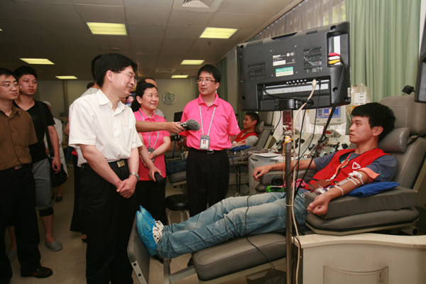 图1:副省长郑继伟看望献血志愿者时与胡庆元进行交流