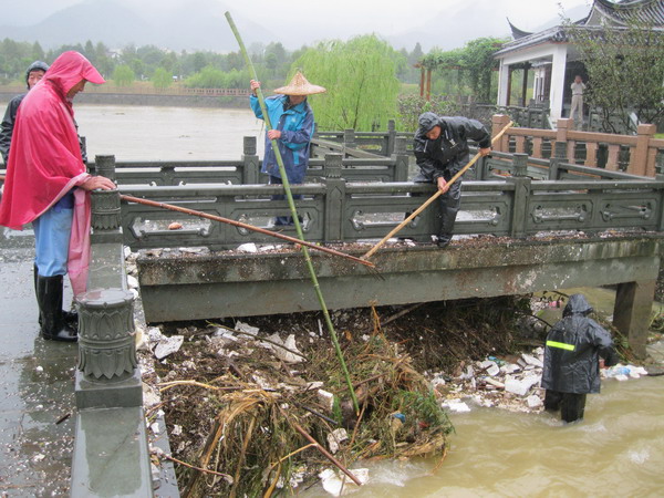 暴雨如注,听松食堂配电房、精艺园配电房、行政楼西地下室相继进水,后勤公司组织人员、抽调水泵抽水。西蜜湖部分驳坎被水流冲断,后勤公司、校建处、保卫处及时进行应急处理,在现场拉起警戒线、竖立警示牌,并立即联系相应管理部门杭州市运河综保委。水流席卷的残枝在西蜜湖和兴曲桥附近区域水面集聚,后勤员工不间断清理,确保水路畅通。校史馆、听松公寓食堂部分屋顶出现渗漏,校建处第一时间赶到现场,组织人员采取有效措施控制灾情。