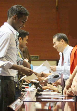 9月11日,学校2013年度外国留学生奖学金颁奖典礼在图书馆西报告厅隆重举行。校长叶高翔出席并致辞。相关二级学院负责人及来自50多个国家的260余名外国留学生新生参加典礼。