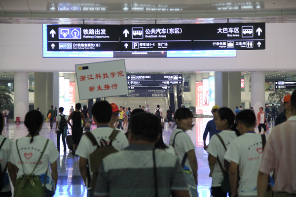 早上5点半,搭载着志愿者的接站大巴就从小和山驶向了杭州城站火车站、东站火车站和九堡客运中心。7点未到,学校和两个公寓区门口都已站满了热情的学长学姐。当天,数不清的小红帽在车站和校园内忙碌。