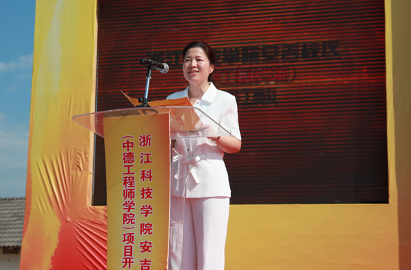 王建华代表全校师生员工及远道而来的德国留学生向安吉县委、县政府,湖州市委、市政府表示衷心感谢,对省政府、省教育厅、发改委、财政厅等各级领导在项目筹建过程中给予的关心和支持表示衷心感谢。他说,中德工程师学院落户安吉,是浙江科技学院、安吉县携手强化创新驱动,贯彻科教人才强省战略的共同选择,也是校地联姻结亲,共图科学发展的良好开端,使浙江科技学院的发展有了一个新的平台,也使安吉的大学梦正式开启。在接下来一两年的时间里,项目建设时间相当紧张,任务十分繁重。希望与安吉县一起,加强沟通,有效协作,希望并要求项目建设单位、设计单位、施工单位以争创“鲁班奖”为工作目标,以铁的意志、火的激情,全力做好各项建设工作,确保把项目工程建成国内高校一流的质量工程、安全工程、品牌工程和廉洁工程。