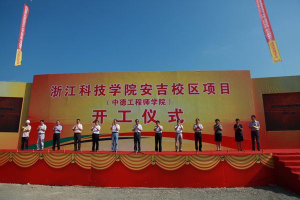 7月18日,安吉校区(中德工程师学院)项目开工仪式在安吉教科文新区举行。湖州市委书记马以,省教育厅副厅长鲍学军,湖州市委常委、秘书长高屹,校党委书记王建华、校长叶高翔等我校党政班子成员,安吉县委书记单锦炎,县委副书记、县长王树,县人大常委会主任梁为民,政协主席叶海珍,县委副书记陆为民等县四套班子领导出席开工仪式。我校相关职能部门负责人、教代会代表、学生代表、德国教授代表和留学生代表及安吉县教育局、皈山乡负责人,项目建设单位和监理单位负责人等参加开工仪式。