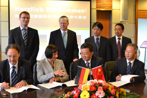 图1为马奇(后排左二)、蒋胜祥(后排左三)等见证我校与埃尔富特应用科技大学签署合作意向书