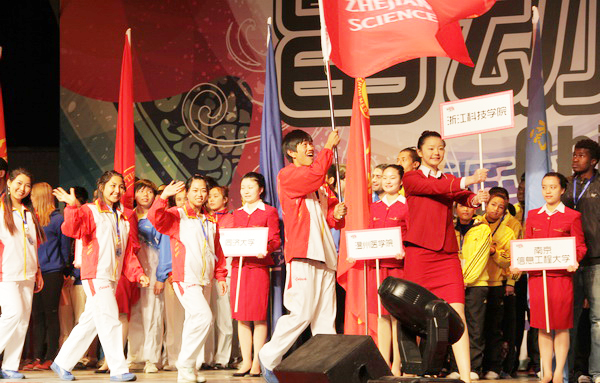 在首日举行的民族传统体育展示项目比赛中,复旦大学的南刀表演夺冠,我校8名留学生表演了精彩的中国传统舞狮,4名男生将红黄两只雄狮舞动得威风八面,栩栩如生,4名女生敲锣打鼓配合完美,获得亚军。