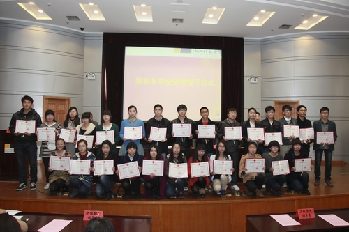 赵东福宣读表彰文件。2011-2012学年我校共评出“校特优学风示范班”10个,“校特优学风班” 13个,“校优良学风班”45个。26名同学获得国家奖学金,490名同学获得国家励志奖学金,910名同学被评为三好学生,3438人次获评校级各类奖学金。