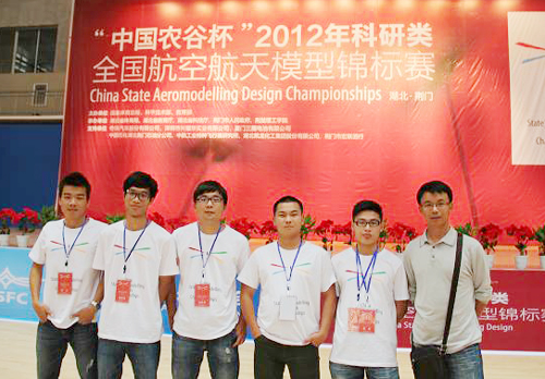 我校由体育部常德胜、陈晨老师率5 名同学参加了遥控电动模型滑翔机、模型火箭模拟航天器发射返回两个项目的比赛,获两项二等奖,实现我校在科研类航空航天模型锦标赛中的突破。其中,电子信息科学与技术09级韩亮、谢浩杰和包装工程10级邱涛同学获得遥控电动模型滑翔机项目二等奖;这三名同学还与信息学院计算机科学与技术10级傅攀攀、包装工程10级严明翰同学获得了模型火箭模拟航天器发射返回外观设计二等奖。