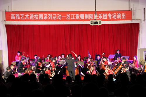 4月13日晚,由浙江省教育厅、文化厅、财政厅共同主办的“高雅艺术进校园”系列活动之一——浙江歌舞剧院民乐团专场演出在我校举行,600多名师生一起聆听了精彩的民族音乐之声。