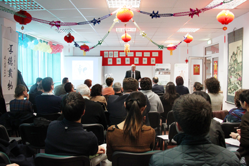 Zagrean Iosif教授从《说文解字》对“医、针、灸”汉字结构的分析开始,用罗文向大家讲解了奇妙的中医哲学。讲座图文并茂、深入浅出地解释了“阴阳、五行”等相关中医理论,并结合人体经络图给大家现场展示了一些简单的中医穴位按摩法。讲座中,来宾们专心听讲、认真记录,并不时提出一些有关健康养生的问题。