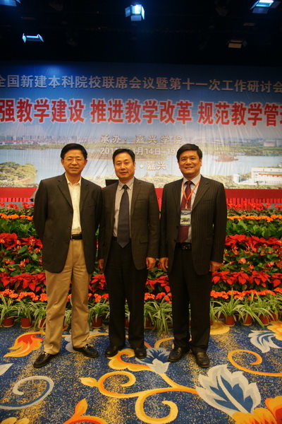 图2为校党委书记王建华与省委教育工委书记、教育厅副厅长汪晓村(中)、嘉兴学院党委书记胡建成(右)一起