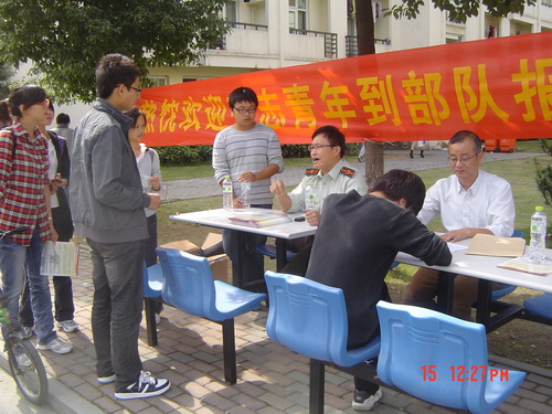 10月15日至17日,校人武部联合西湖区人武部、留下街道人武部在学校西和公寓、东和公寓、和山广场三个场地开展现场咨询和报名活动,就2011年冬季大学生征兵的政策变化、体检标准、大学生入伍的优惠政策等进行广泛宣传。活动期间,校党委副书记陈根芳到现场进行指导。