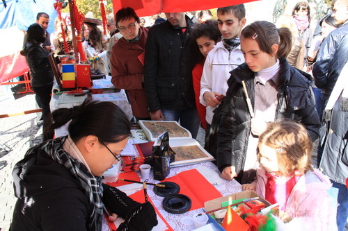 15日至16日,在克鲁日市中心的统一广场,孔子学院进行了现场展示,醒目的“游世界、看中国”横幅、红红火火的中国结、悠扬婉转的中国民歌、浓浓的茉莉茶香吸引了众多克鲁日市民在孔院展位前流连忘返。现场的中国茶道表演、饮食及绘画书展、琳琅满目的罗语版茶文化宣传册及孔子名言书签、中国剪纸艺术和“九连环”、“毽子”等传统益智游戏让人们对中国文化有了更为深刻的认识。此次活动,中国教师现场为300多人书写了中文名字(图1),中国汉字的文化魅力再一次获得了人们的喝彩。500多人品尝了中国茶,西湖龙井绿茶、铁观音、普洱茶及茉莉花茶的独特香气让克鲁日市民回味无穷。此次多元文化艺术节分为几个不同展区,包括克鲁日市繁华商业中心大厦和大学生文化中心,孔子学院分别在这两个展区举办了中国图片展和电影宣传活动,从憨厚可爱的大熊猫到繁华的都市面貌,“中国”二字在克鲁日市民的心中越发地鲜活生动了。