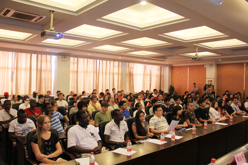 近日,我校2011级外国留学生开学典礼暨奖学金颁奖典礼举行。副校长吕进出席典礼并致辞。国际处、各相关二级学院负责人及来自世界各地60多个国家的150余名外国留学生新生参加典礼。