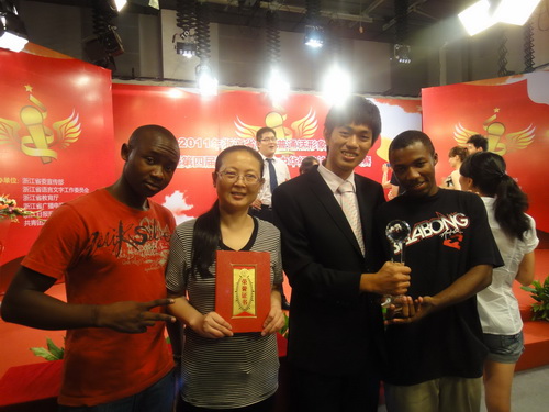 董经诗同学选修校公共选修课《演讲与口才》,经指导老师挖掘参加本次大赛。在5月份校内选拔赛胜出后,他以视频形式参加省预赛,暑假期间也放弃回国留在学校准备决赛。决赛现场,董经诗以对徐志摩《再别康桥》的准确演绎,流利的普通话,征服了挑剔的评委、嘉宾及观众。才艺展示中,董经诗同学更是以一曲轻松愉快的吉它弹唱《对面的女孩看过来》赢得了在场观众的热烈掌声,他和另四位助阵的我校留学生和大学生诙谐幽默的精彩表演把全场气氛推向了高潮。