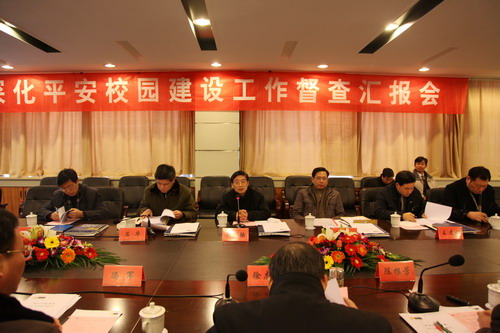 校党委书记徐志平在汇报会上代表学校党政和全校师生对督查组一行的到来表示热烈的欢迎。他说,深化“平安校园”建设是一项系统工程, 深化“平安校园” 建设是高校义不容辞的社会责任。徐志平介绍了我校近年来的发展概况以及深化“平安校园”建设工作的总体情况。校党委副书记陈根芳代表学校就我校深化“平安校园”建设工作作了具体汇报。