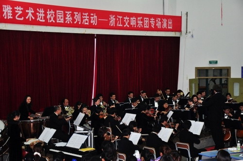 11月8日晚,由浙江省教育厅、文化厅、财政厅共同主办的“高雅艺术进校园”系列活动之一——浙江交响乐团专场演出在我校举行,乐团首席指挥、德国指挥家埃拉胡•冯•艾伦巴赫担任本场演出指挥,600多名师生一起聆听了精彩的音乐之声。艾伦巴赫是第一位受聘于文化部与官方签约的外籍指挥家。