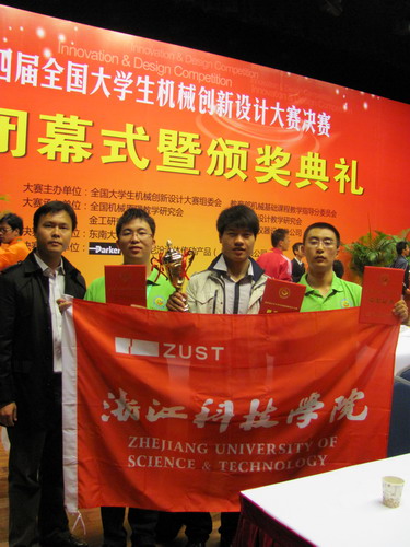 本次比赛由全国大学生机械创新设计大赛组委会和教育部高等学校机械基础课程教学指导分委员会主办,以“珍爱生命,奉献社会”为主题,立足于“在突发灾难中,用于救援、破障、逃生、避难的机械产品的设计与制作”,共吸引了全国28个省市的404所高校2760支队伍计13800余名选手参加。经过各省层层选拔,共149支队伍进入了决赛评审阶段的角逐。经过紧张的设计说明书评审、实物模型演示和现场答辩等竞赛程序,我校机械学院由李其朋、邹凤楼老师指导、金何杰、马奇、乐寒晓、刘超豪、陈道泉设计制作的“压控自适型高楼自救装置”获国家二等奖。