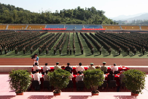 9月9日上午,2010级学生军训动员大会在小和山校区田径场隆重举行。校党委副书记陈根芳、副校长赵东福出席动员大会。武警杭州指挥学院训练部负责人和我校相关职能部门及二级学院党总支负责人参加会议。