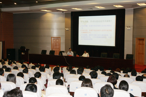沈满洪就学术规范的内涵界定、学术规范的现状评析、学术规范的建设对策等三个方面展开报告,重点阐述了学术规范的基本内容、学术规范与科技创新的关系、学术失范的表现形式及危害、学术失范的根源、学术规范建设的制度结构、学术规范教育的重要性等内容。他指出,科技创新必须以遵守学术规范为前提,知识分子是社会的良心,大学教师是知识分子的重要组成部分,必须共同遵守学术圈内的基本规范。沈满洪建议,要从制度、思想教育等多层面加强学术规范建设。