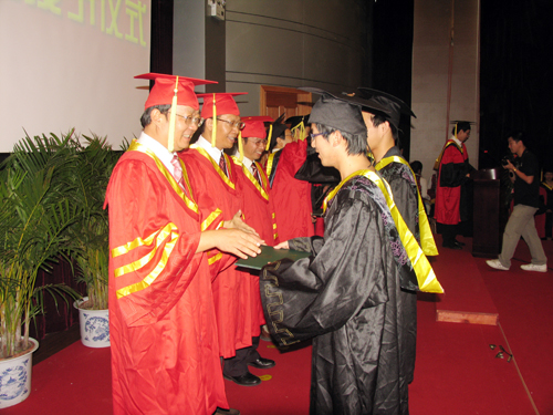 6月24日上午,2009届学位授予仪式在图书信息中心报告厅隆重举行。校长杜卫,校党委副书记、副校长陈根芳,副校长赵东福及校学位委员会成员与每一名获得学位的毕业生一一握手亲授颁授学位。