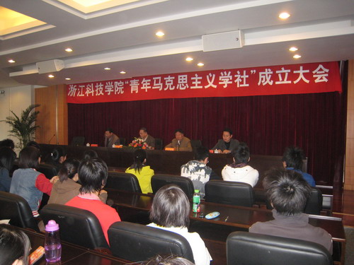 3月26日,校青年马克思主义学社成立。校党委副书记胡浙平出席成立大会并讲话。这是浙江省属高校成立的首个学生马克思主义学习社团。社科部、团委负责人、教师代表和青年马克思主义学社首批70多名同学参加了成立仪式。